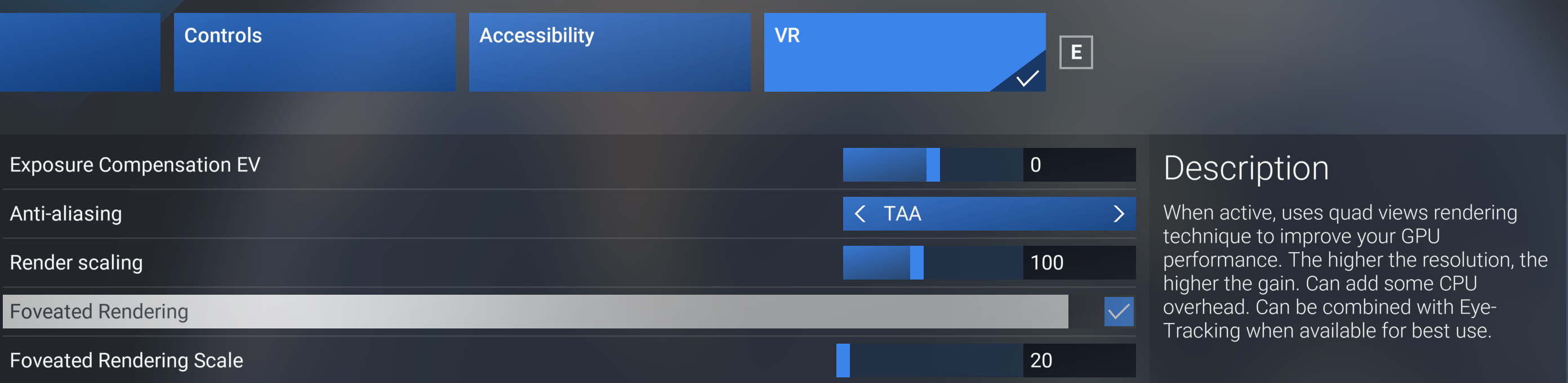 To Enable DFR: Enable "Foveated Rendering" in VR settings. Adjust "Foveated Rendering Scale" as desired (lower will increase performance, but decrease the size of the central focus area)