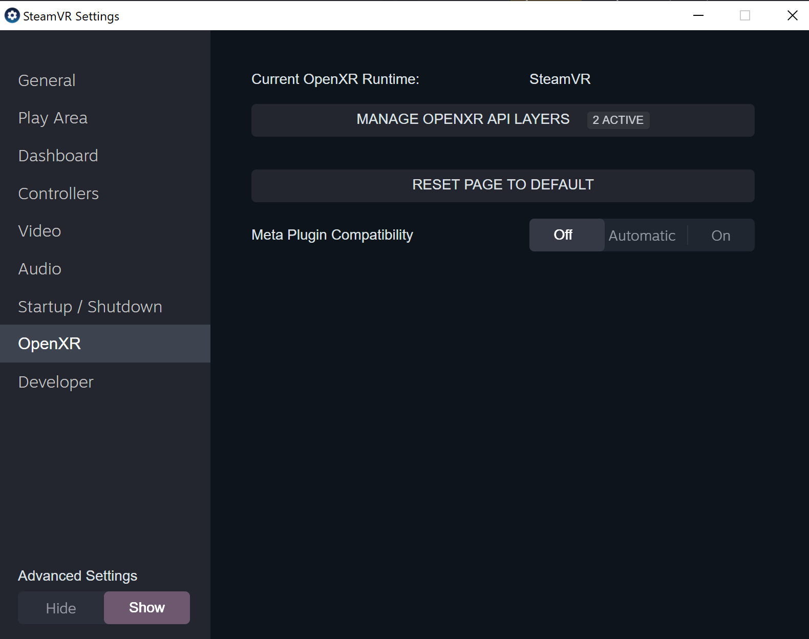 Head to the OpenXR page. Ensure "Current OpenXR Runtime" says SteamVR. (otherwise, hit the "Set SteamVR as OpenXR Runtime" button)