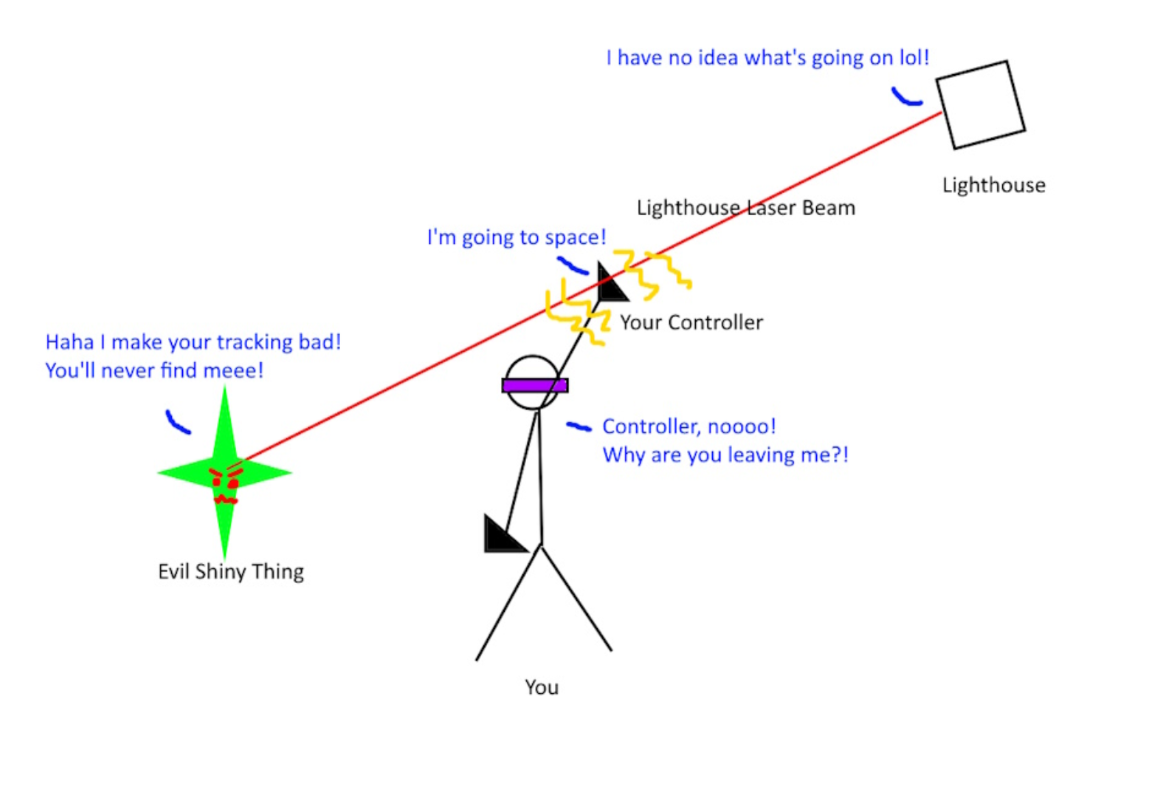 But what happens if that laser beam hits a reflective object and then hits the Beyond? That's known as a "back facing hit", and SteamVR needs to filter these bad hits out to maintain accuracy. Too many back facing hits, and tracking loss will suffer! Because of the small physical size of the Beyond, it can be a little harder to filter out bad hits with the tightly clustered tracking diodes compared to the Index.