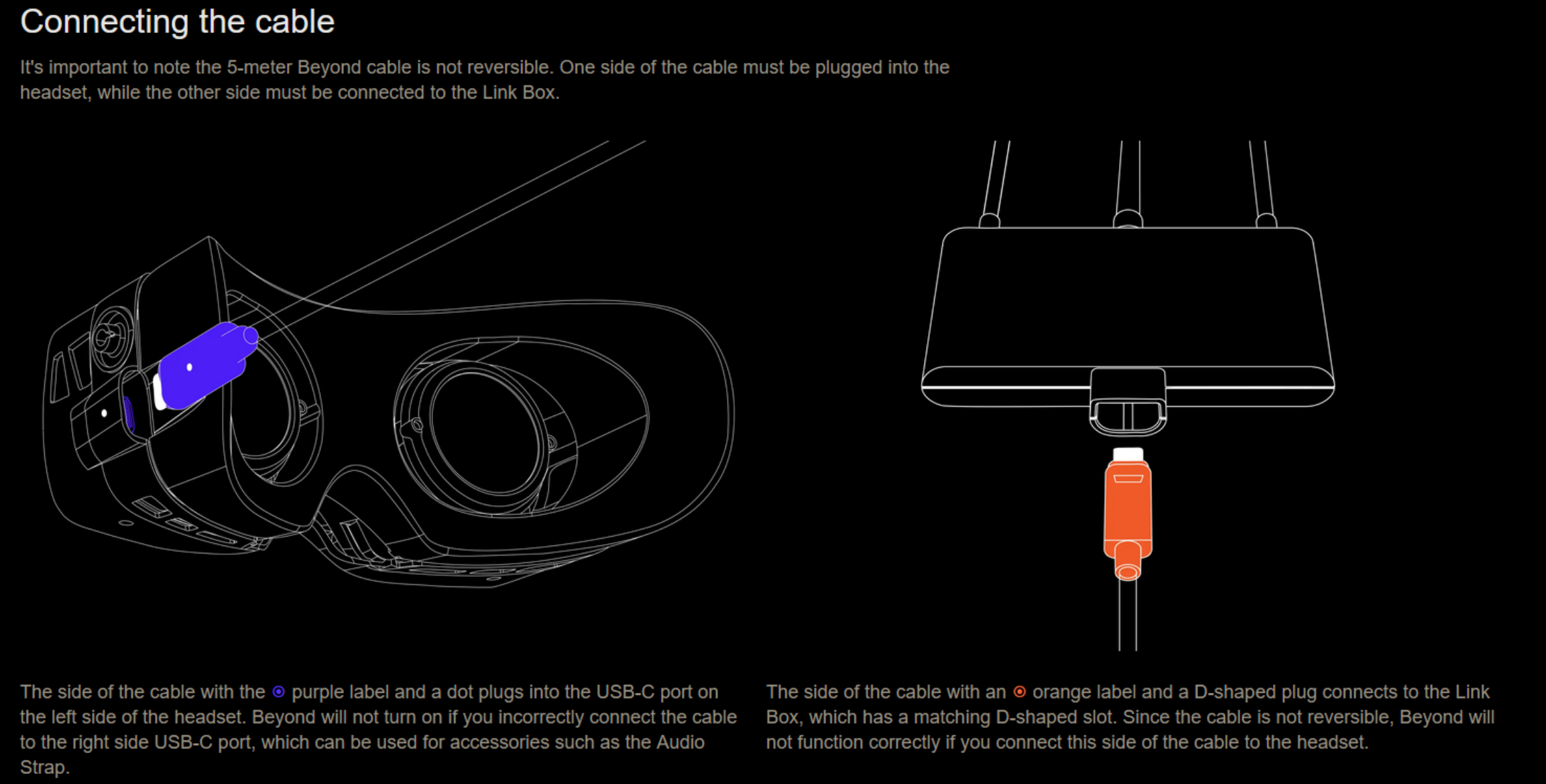 The long USB-C cable between the headset and the linkbox is not reversible and has a couple of particular requirements in how it's connected to both devices.