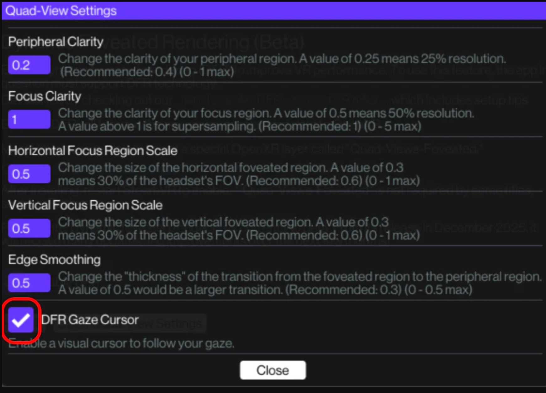 Enable the Gaze Cursor: In your Quad-View Settings (or eye tracking utility), enable the gaze cursor option to reveal a floating cursor in your VR view.