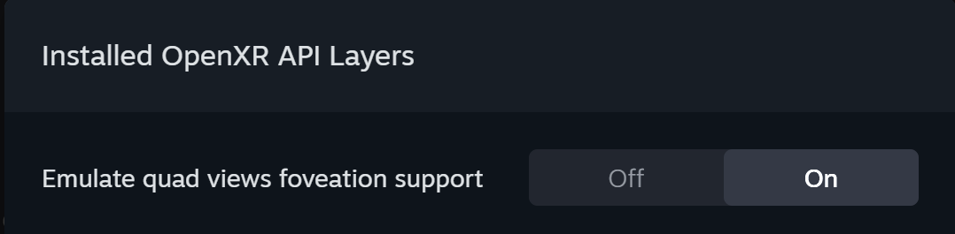 In SteamVR > OpenXR > Manage OpenXR Layers, "Emulate quad views foveation support"